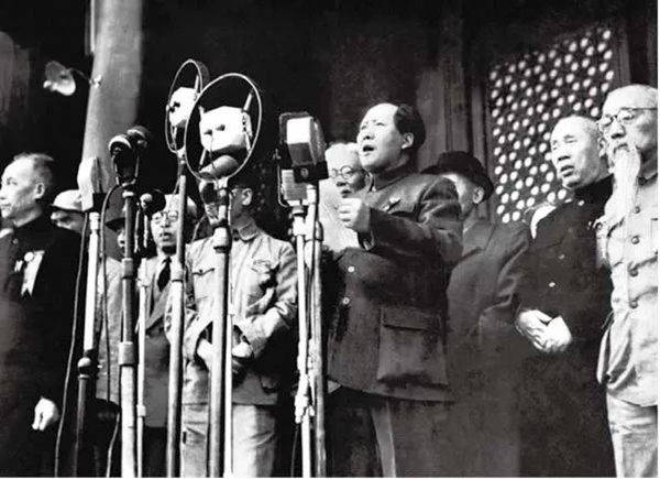 1949年10月1日开国大典,毛泽东在天安门城楼上宣读中华人民共和国中央人民政府公告。