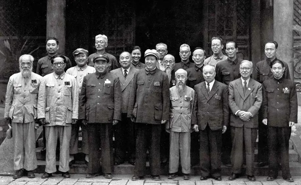 1949年7月5日,毛泽东、周恩来、朱德和新政协筹委会全体常务委员合影。前排左起:谭平山、章伯钧、朱德、毛泽东、沈钧儒、李济深、陈嘉庚、沈雁冰(茅盾)。二排左起:黄炎培、马寅初、陈叔通、郭沫若、蔡廷锴、乌兰夫。三排左起:周恩来、林伯渠、蔡畅、张奚若、马叙伦、李立三。
